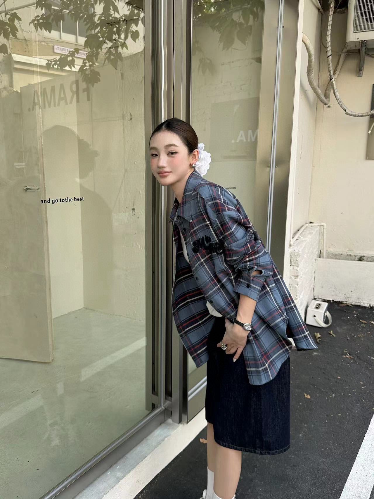 Miu Miu Lettered Hair-On-Hide Embroidered Flannel Check Shirt