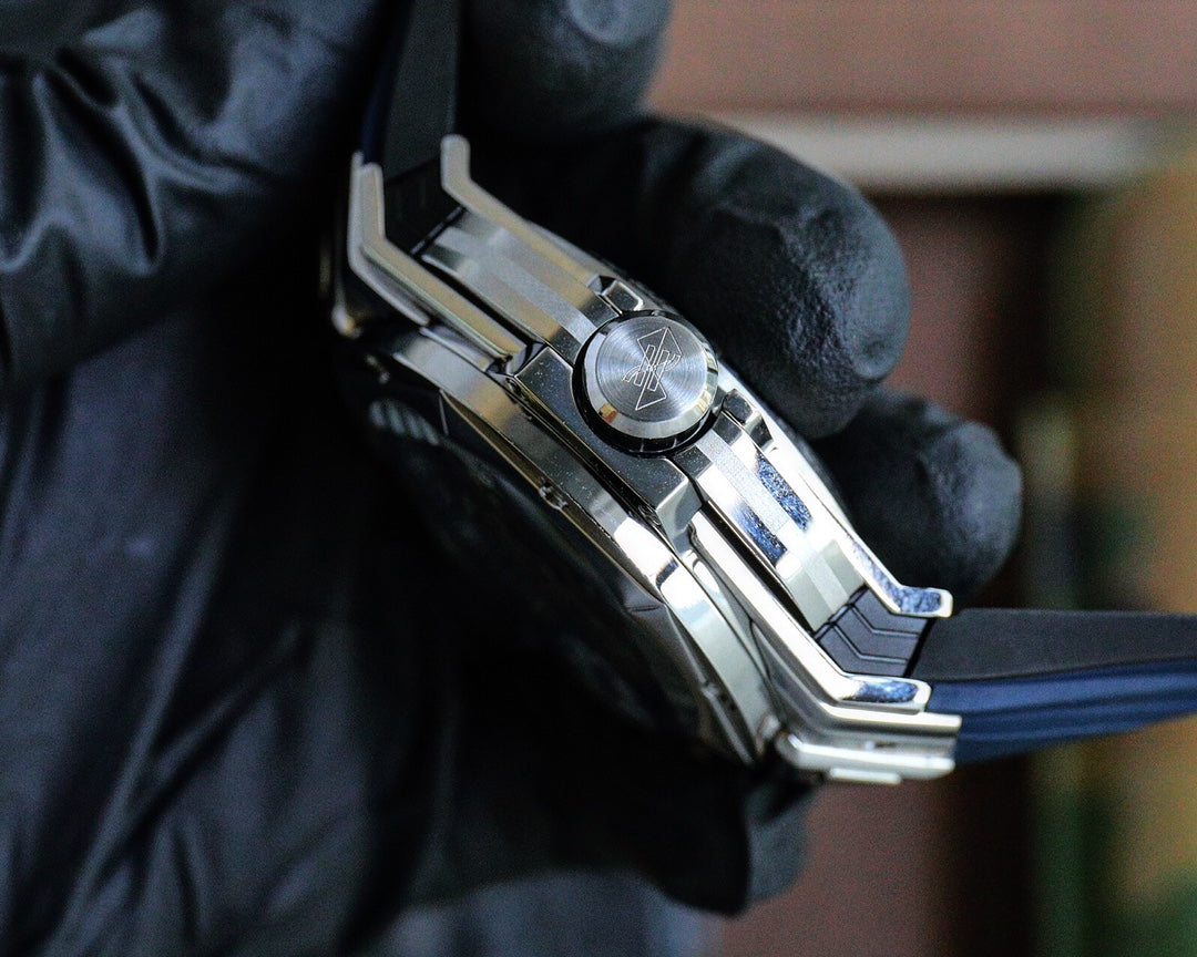Sculpted lugs with sharp angles and bold lines enhance the watch’s architectural character.