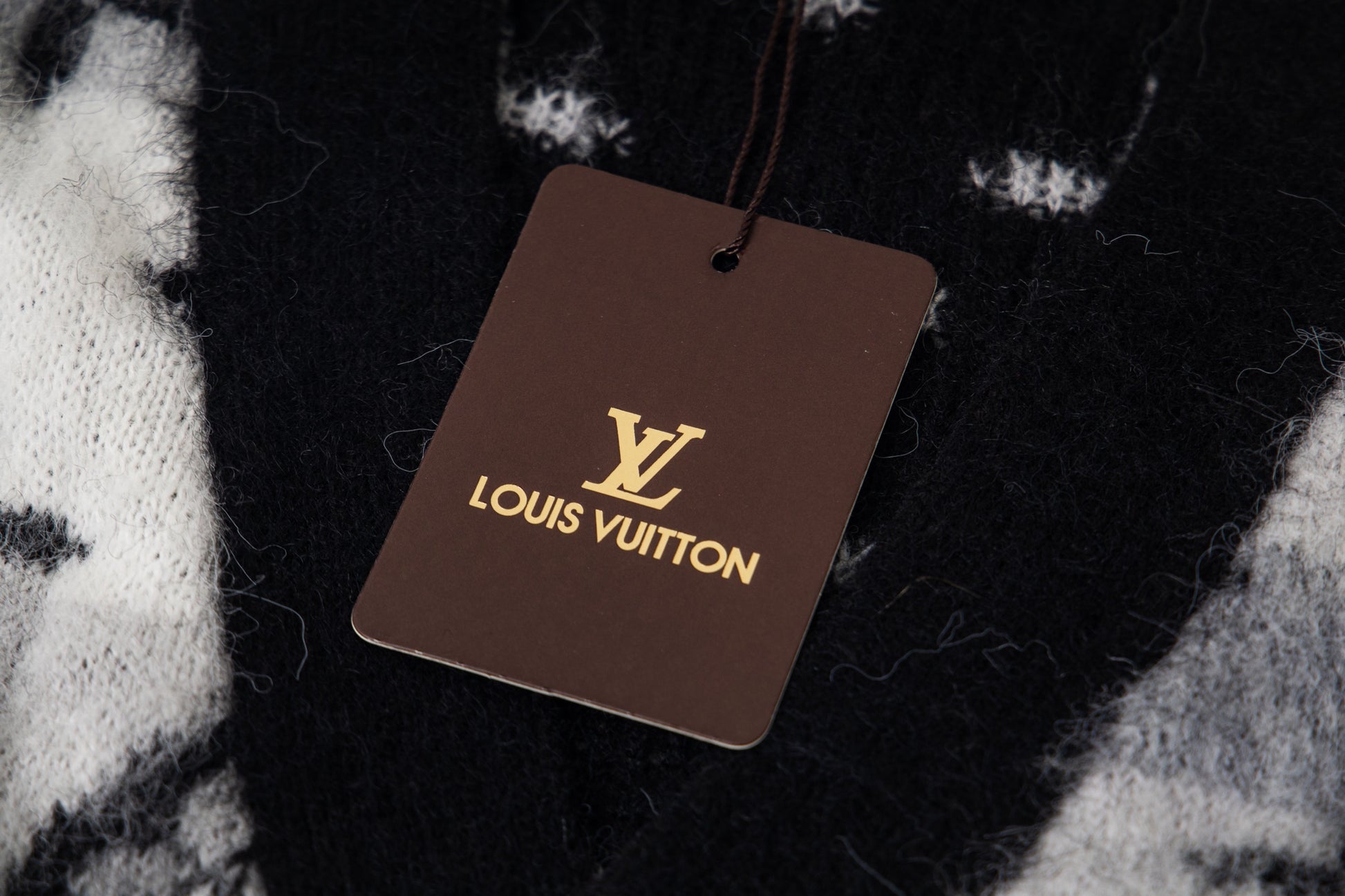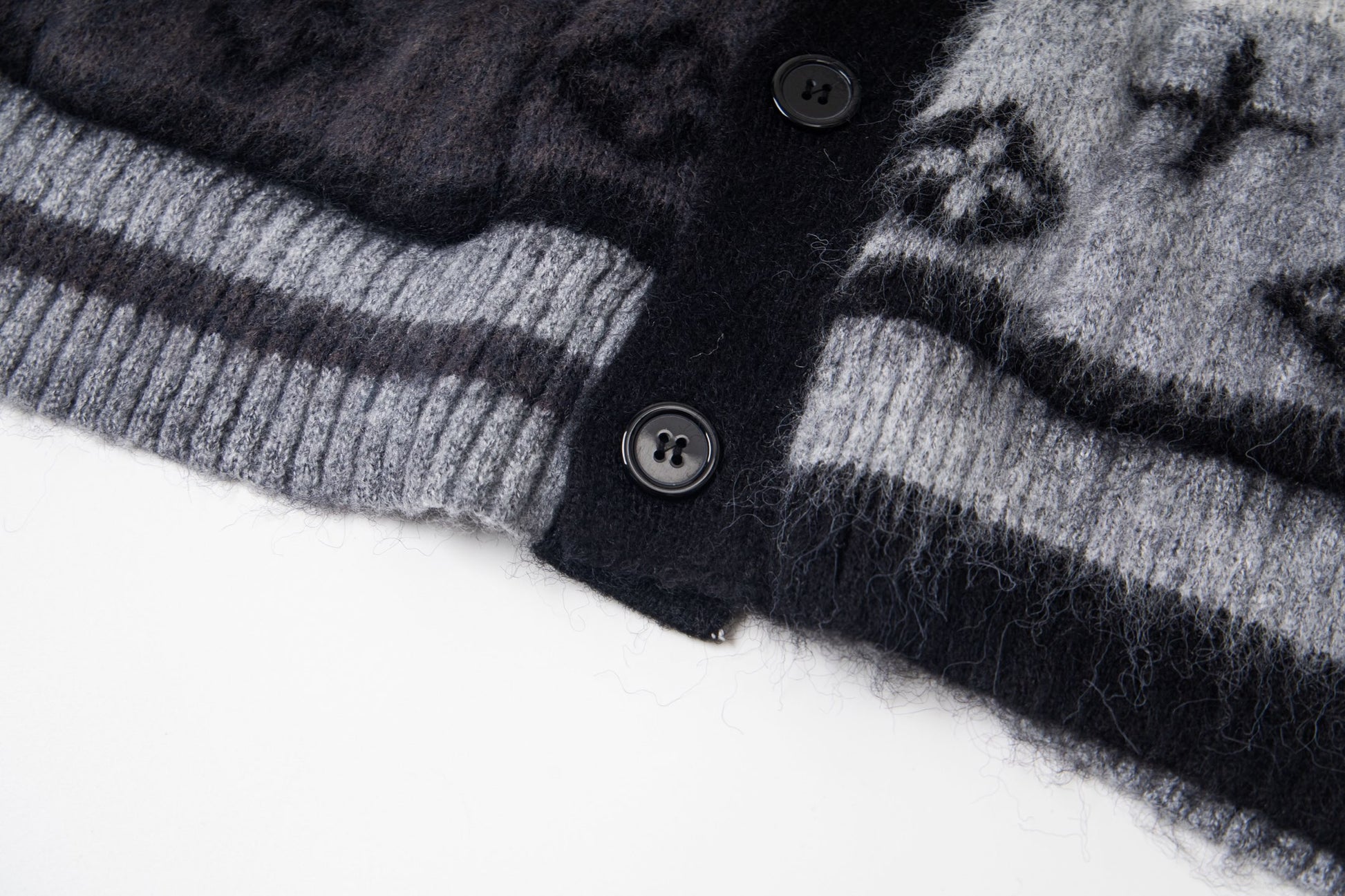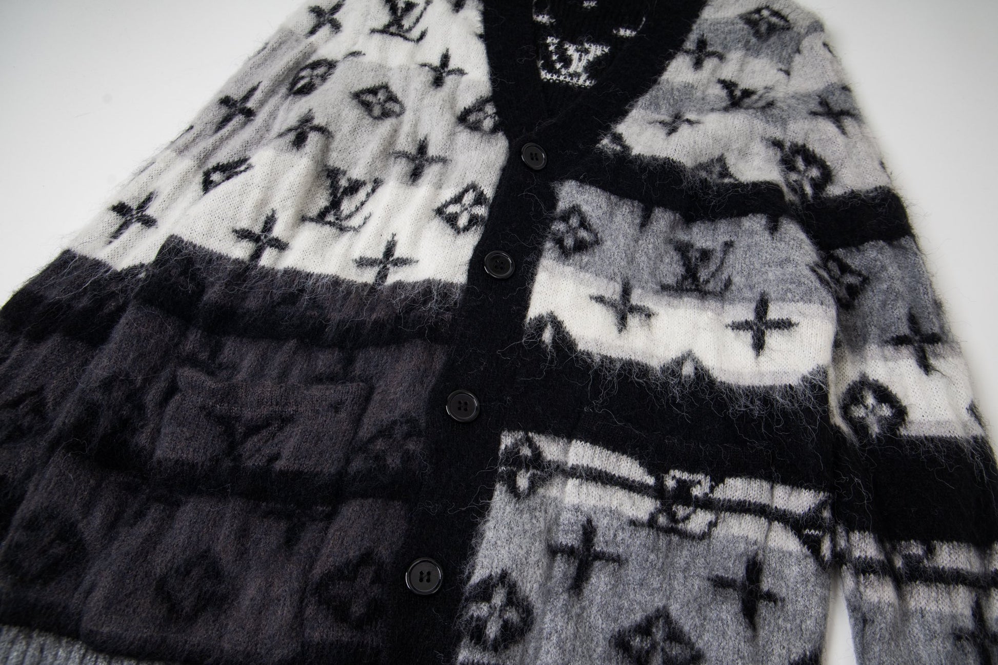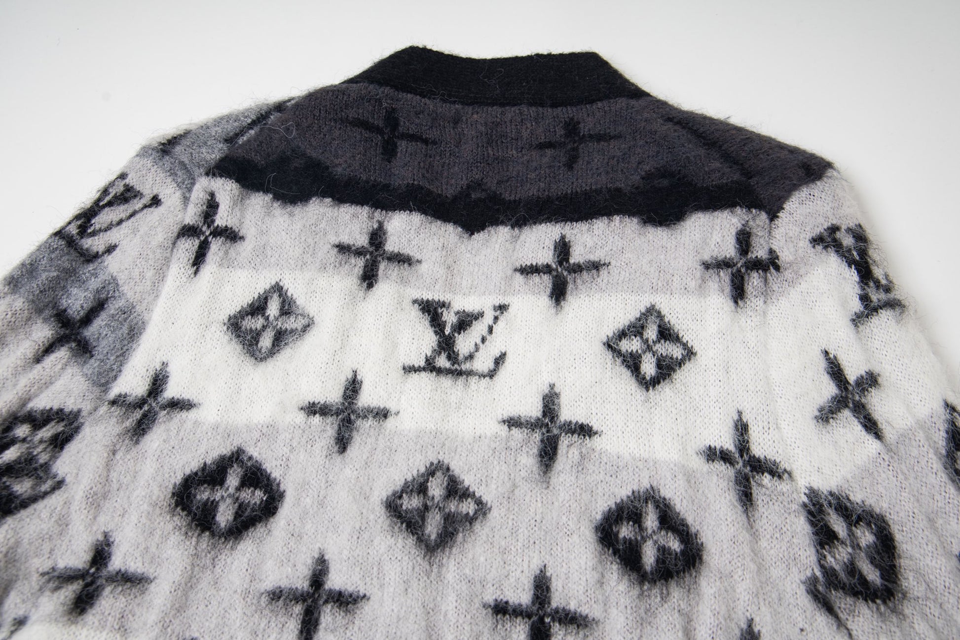 Crafted from a luxurious blend of 67% mohair, 28% nylon, and 5% wool, this cardigan is made using premium, finely spun mohair and imported Stoll knitting machinery. The design features precise alignment of the Monogram pattern across the entire garment in a sophisticated black, white, and gray gradient.