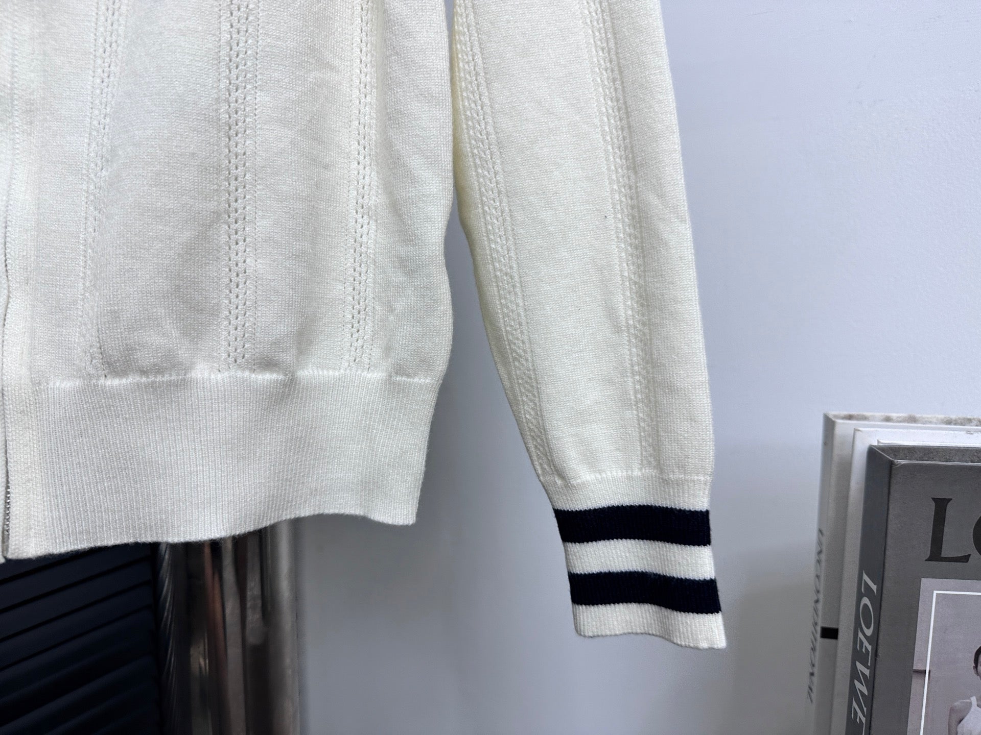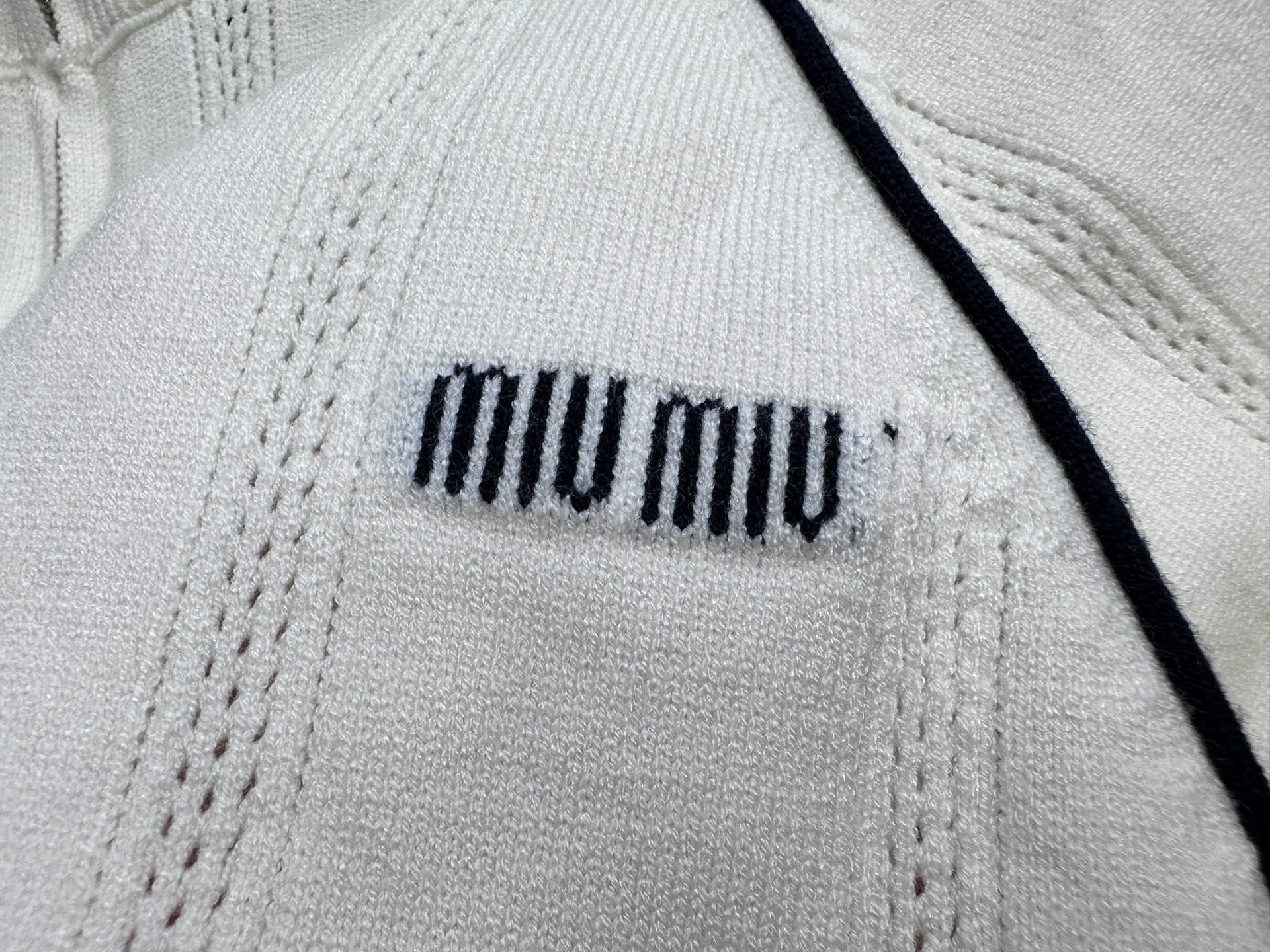 This MIU MIU early autumn knit cardigan features a collegiate-inspired stand collar and zip-up design. Crafted with a slim, tailored fit, it flatters all body types and offers versatile styling options. The sporty letter jacquard adds a modern, youthful touch, making it perfect for layering and effortless everyday wear.