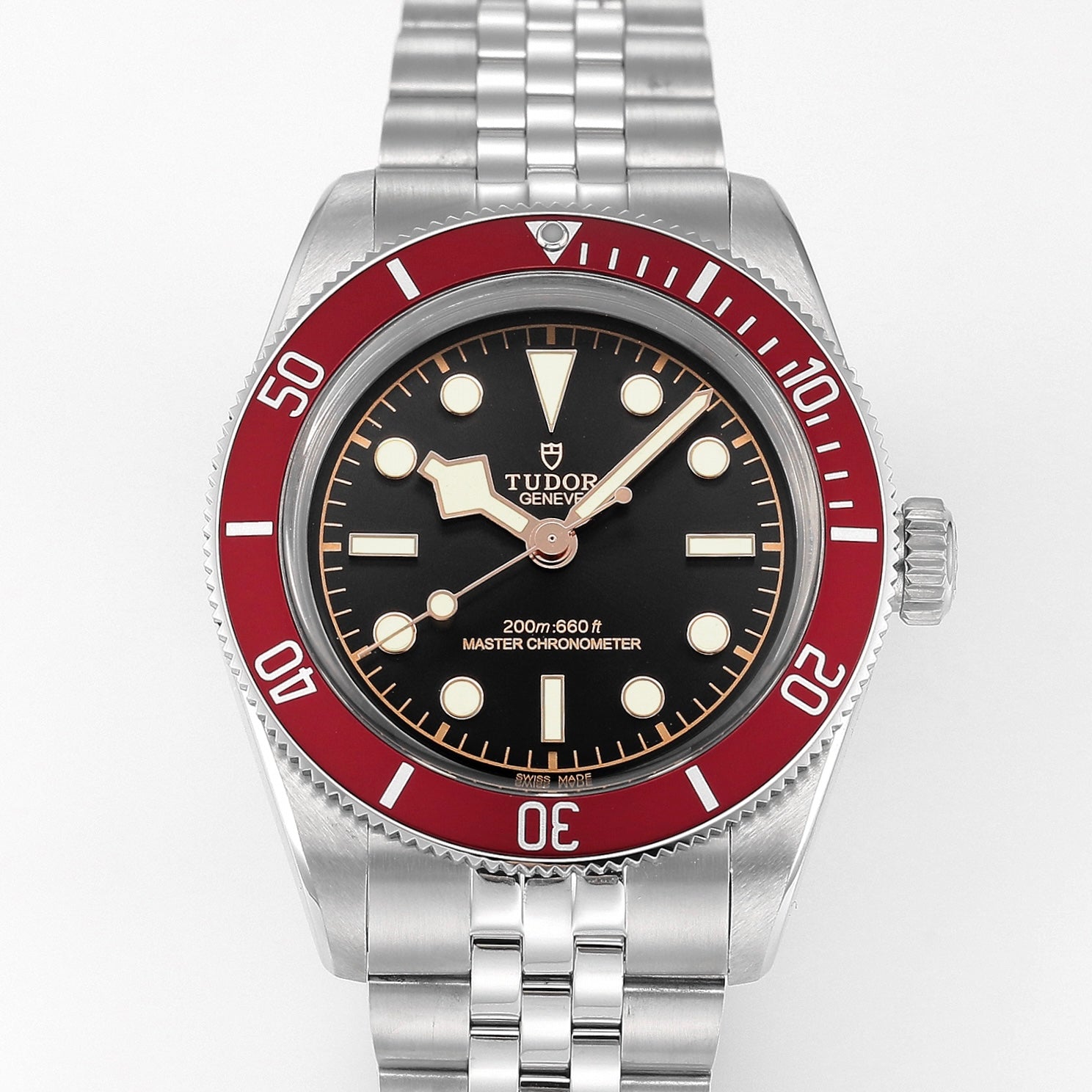 The latest Tudor Black Bay third-generation model exudes a strong vintage vibe. The watch features a polished five-link bracelet, offering a classic yet refined aesthetic. With a 41mm case diameter, it’s the perfect size for daily wear. The stainless steel case is finished with a large brushed surface, enhancing its sporty and casual feel. The red aluminum bezel is unidirectional, adding both style and functionality.